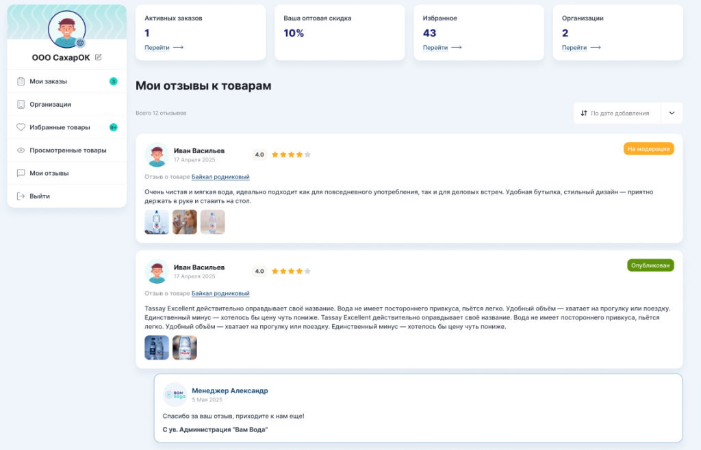 - личный кабинет с историей заказов;