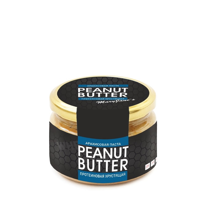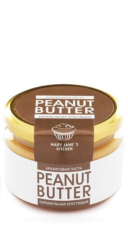 стеклянная банкаАрахисовая паста «Протеиновая хрустящая» – новинка высокобелковой арахисовой пасты с кусочками дробленого арахиса от отечественной красноярской компании "MaryJane's Kitchen". Арахисовая паста «Протеиновая хрустящая» готовится без добавления сахара, соли и масла – она идеально подойдет диабетикам и людям, ведущим здоровый и спортивный образ жизни (данная паста делается с добавлением протеина).